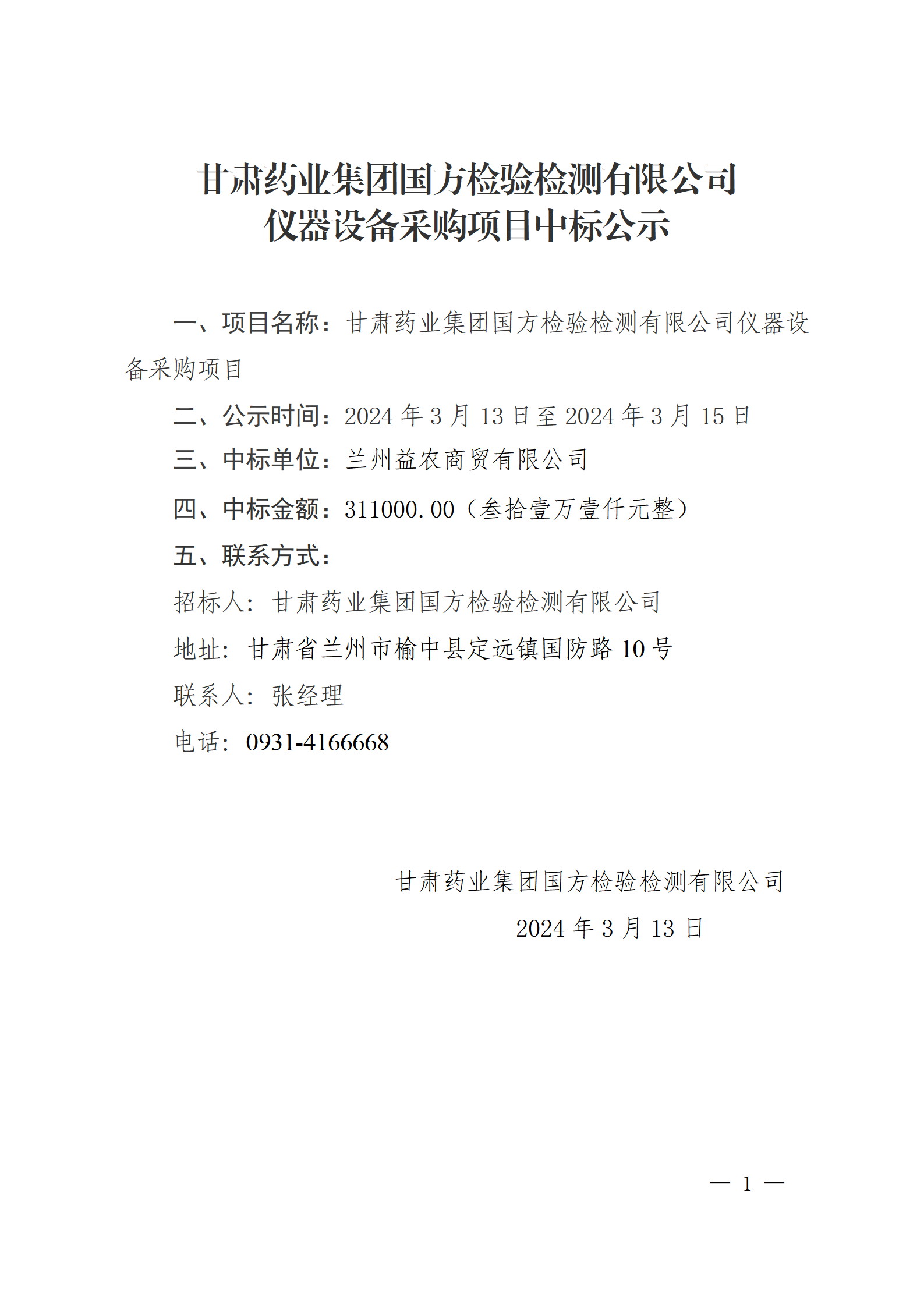 甘肅藥業(yè)集團(tuán)國方檢驗檢測有限公司儀器設(shè)備采購項目中標(biāo)公示