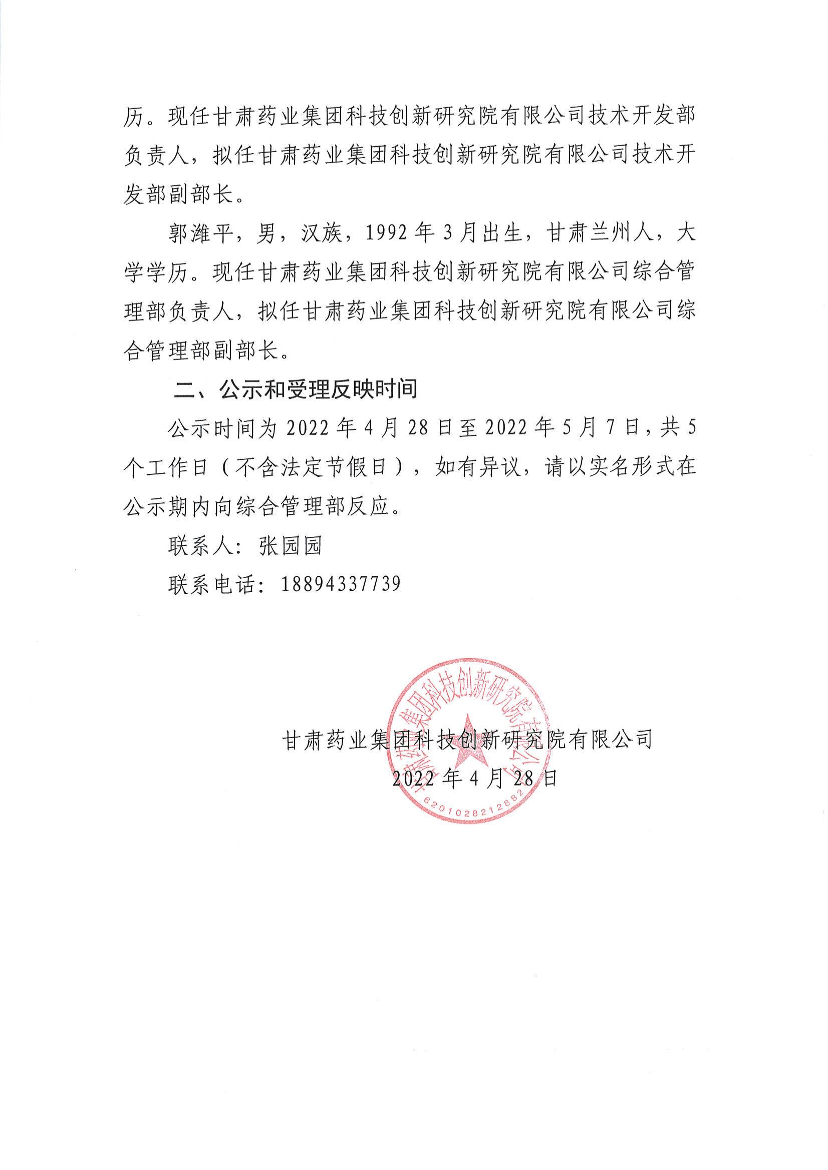 甘肅藥業(yè)集團科技創(chuàng)新研究院有限公司關(guān)于干部任期公示的公告